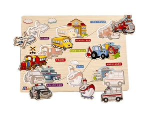 مجموعه من وسائل المواصلات كل شكل ملون بالوان براقة وتحته نفس الشكل يقوم الطفل بمطابقة كل شكل مواصله بالرسم المتاحه علي اللوحه ويطابق الشكل وضعه في المكان المخصص له