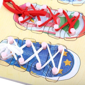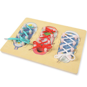 A puzzle consisting of three shoes of different colors. After playing with them and arranging them correctly, the shoe-tying challenge begins. Teach your child how to be independent and tie their shoes by themselves. We made sure that the shoes were the correct size and made of child-safe materials and bright colors to encourage the child to play.