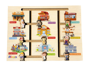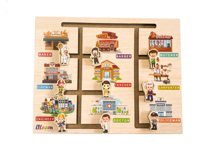 It's a two-in-one game. Through it, children can learn the names and shapes of people's professions, in addition to playing the maze. The goal is to match the professional person's body with the job location.