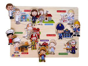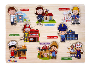 مجموعه من الشخصيات كل شخص يعمل بوظيفه معينه مثل الطبيب والمهندس والخباز والنجار …. الخ يقوم الطفل بوضع كل شخص امام مكانه من خلال مكان عمله والدال علي وظيفته