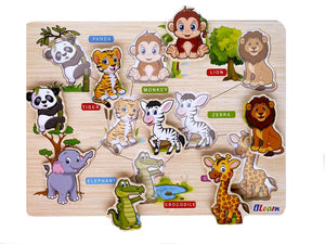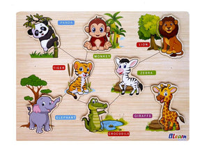 مجموعه من حيوانات الغابه المجسمه كل حيوان تحته مدلول لنفس الحيوان بصوره باهته حتي تسهل علي الطفل وضع كل حيوان ف مكانه مما يساعد الطفل علي تعليم اسماء الحيوانات وشكلها والوانها