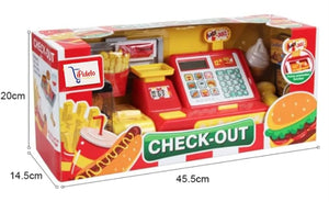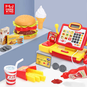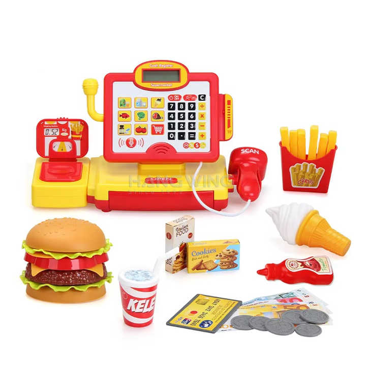 hildren's cashier set includes a cashier with various accessories, such as products and shopping tools.