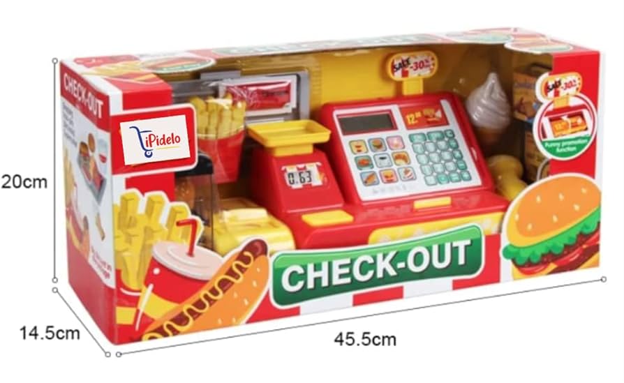 The cashier features sound and light effects to enhance the play experience. It can be used in pretend play to represent shopping scenarios and help children understand basic economic transactions.